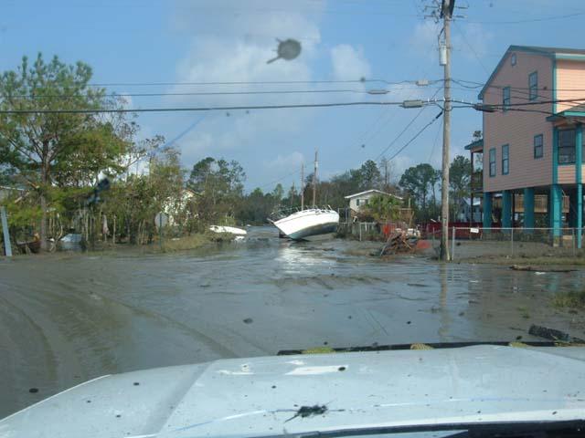 North is actually to the right in the picture. Our camp is on a corner lot and is kinda obstructed by trees. Of note is our neighbor's trailer that blew into the bayou, and a boat in the middle of the road.
