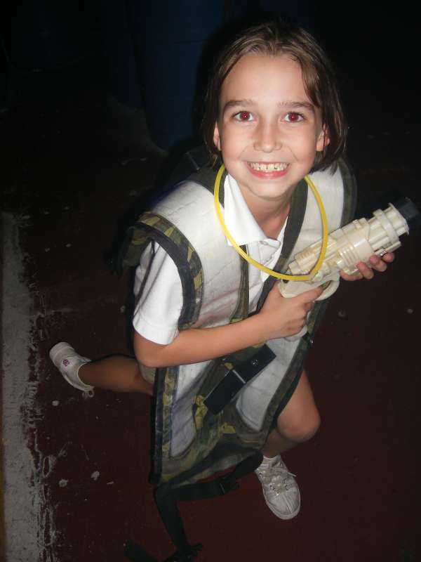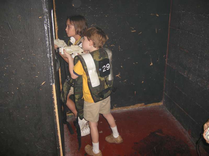 The main attraction at Laser Manis is laser tag! Here Keighly and Michael defend their position.